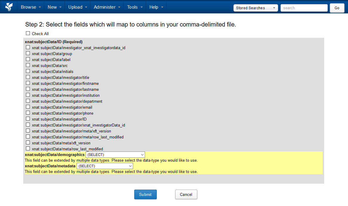4. Select Your Related Fields. Browse through the list of attributes associated with your root data type, and select the appropriate fields. The gender, handedness and year of birth attributes in our CSV file can be found in xnat:subjectData/demographics/xnat:demographicData.