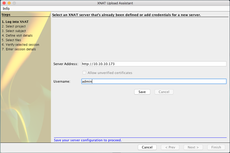 After the update self-check, the first thing that will happen is the Upload Assistant will prompt you to select your XNAT server's login information. You can save the server URL and login name for future usage, but the applet will not save your password.