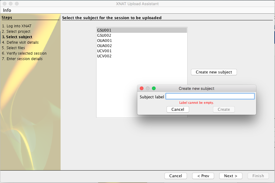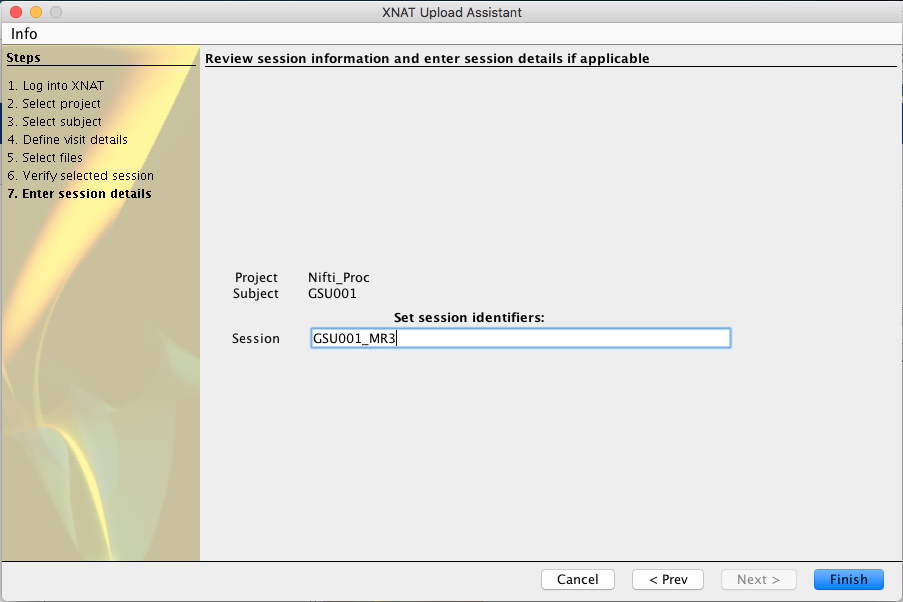 Finally, the upload assistant will verify the project and subject that you selected at the beginning of the upload process, then allow you to name the session. The assistant will auto-suggest a label based on the subject identifier.