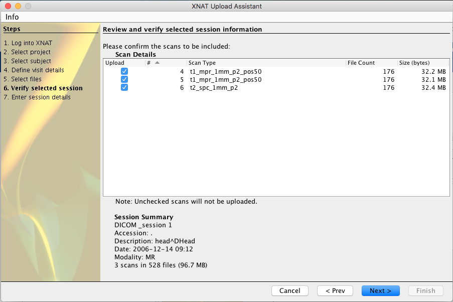 The Upload Assistant will display each scan identified within the image session, and allow you to upload only those scans that are relevant to your study. The assistant will also display highlighted DICOM metadata fields indicating the accession ID, originally intended project, and session date.