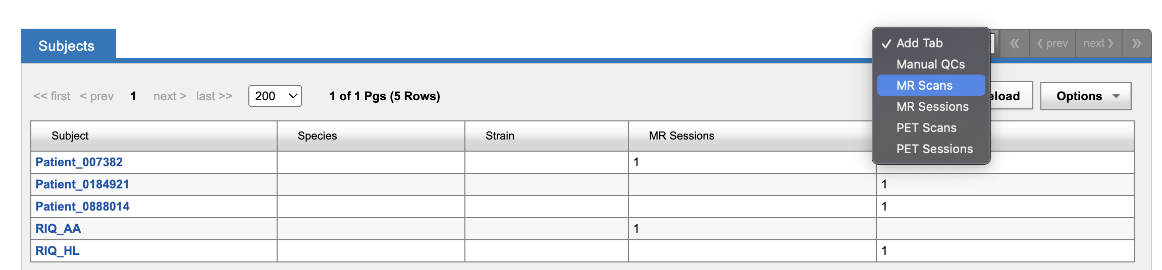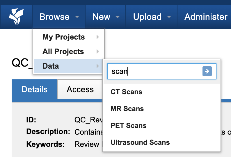 Scan listings are only usable in XNATs where image scan datatypes have been activated. If you do not see these screens, contact your XNAT administrator and ask them to set up the appropriate datatype for your scan modality. See: Managing Data Types in XNAT