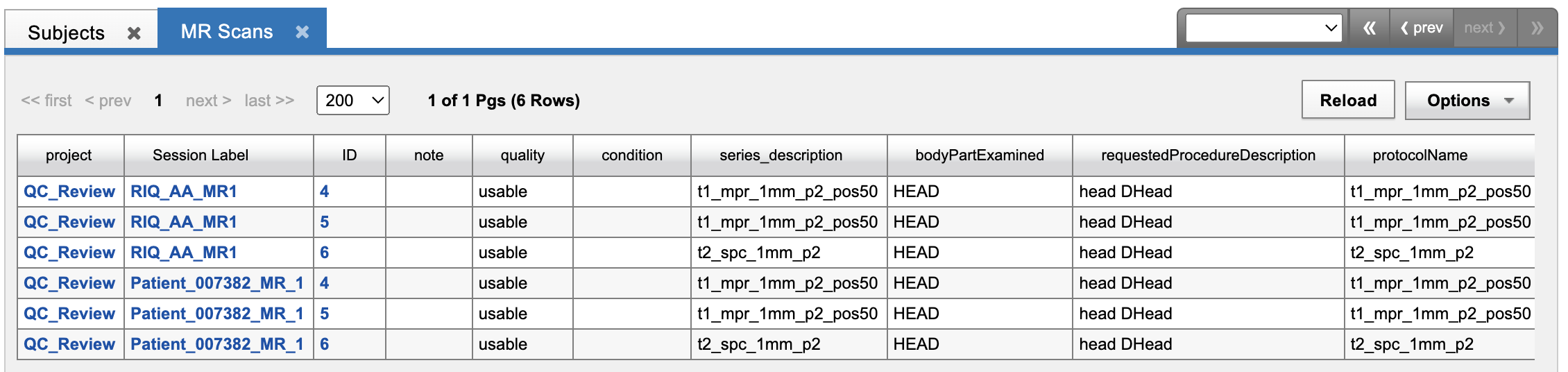 This brings up a data table comparing all scans of that modality in your project. All of the functions associated with data listings apply to this table. See: How to Edit, Filter, and Join Data Tables