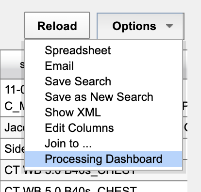 Every data listing has a set of listing actions in a menu in the upper right corner of the panel, in a menu titled "Options". Browse that set of actions to find "Processing Dashboard"