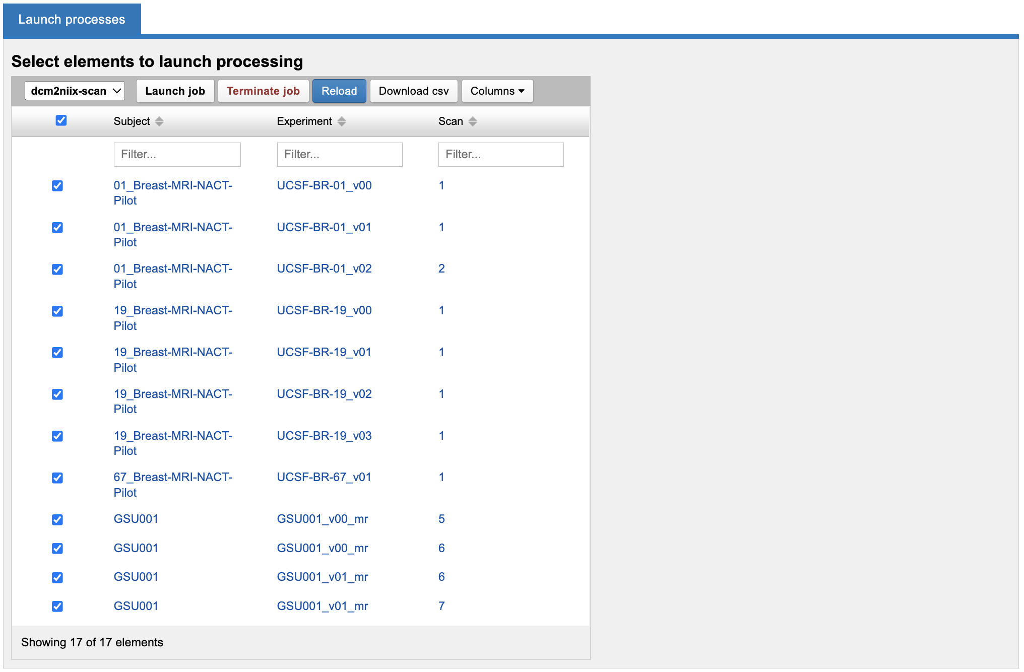 This will load the container bulk-launch processing dashboard with all scans visible in the current data table loaded into the dashboard. This allows you to combine detailed filtering in the data table (for example: selecting all scans where Series Description is LIKE "Axial" and Scanner = "Philips" and quality = "Usable") with the bulk launching capabilities of the processing dashboard.
