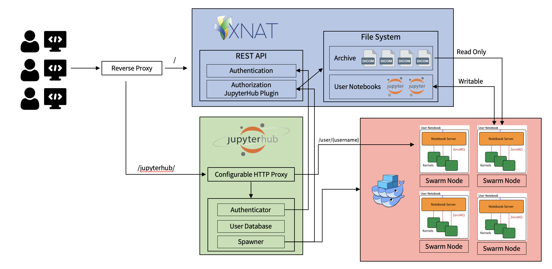 - A SwarmSpawner which spawns single user Jupyter containers on a Docker swarm with bind mounts to parts of the XNAT archive.