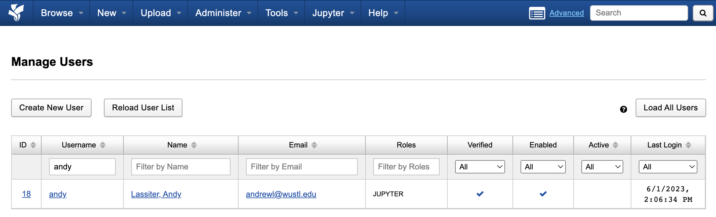Individual users authorized for Jupyter use will be given the 'Jupyter' role, which can also be seen and managed in the 'Manage Users' page.