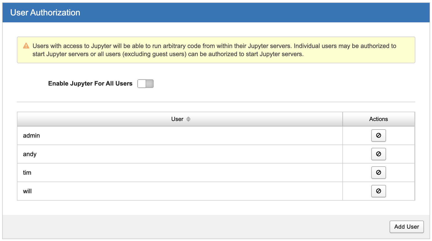 When the toggle switch for enabling Jupyter for all users is disabled, a user list will appear. This list allows you to specify which users are granted access to start Jupyter servers. Only the selected users from the list will have the ability to launch Jupyter servers. Other users who are not selected will not see the option to start Jupyter.