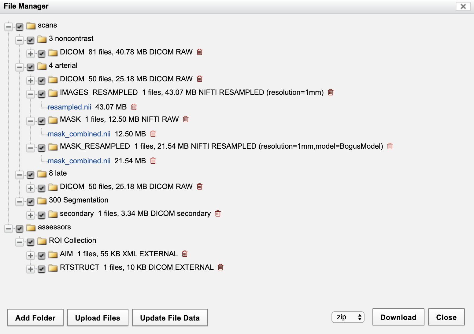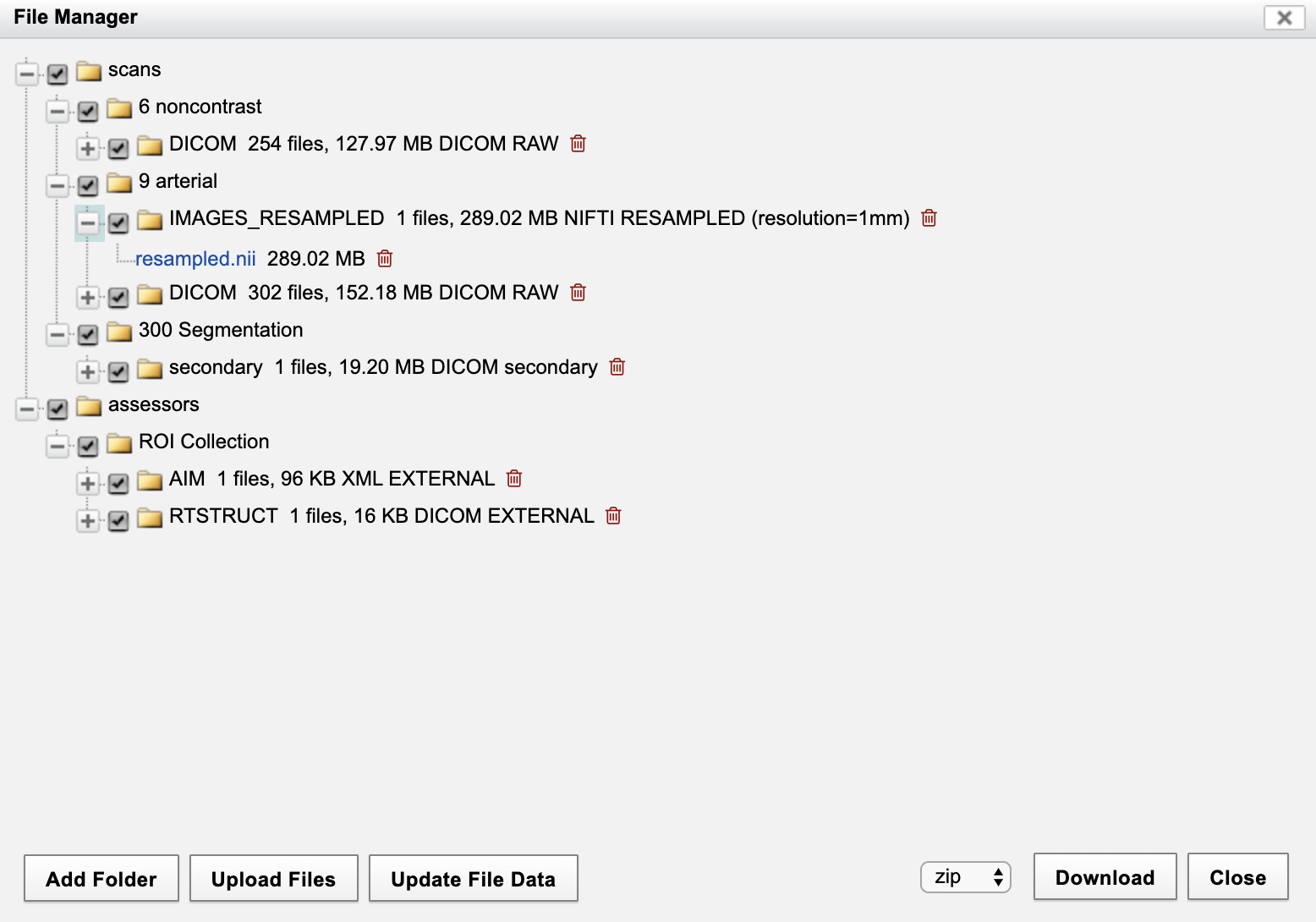 This action results in the original data being resampled and saved in NIFTI format as an XNAT resource on the scan. The generated resource can be seen in the File Manager. On the Session Summary page, click on "File Manager" in the Actions box. This opens the dialog below. Note the file in "IMAGES_RESAMPLED" directory, with the specified name, associated with the arterial-type scan with scan id = 9.