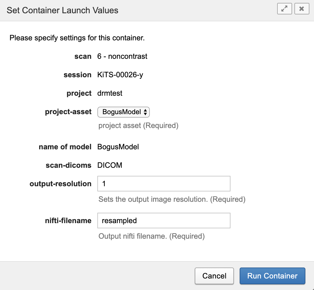 - Click "Run Container". The container will attach the the resampled NIFTI-formated mask data as a resource on the scan.