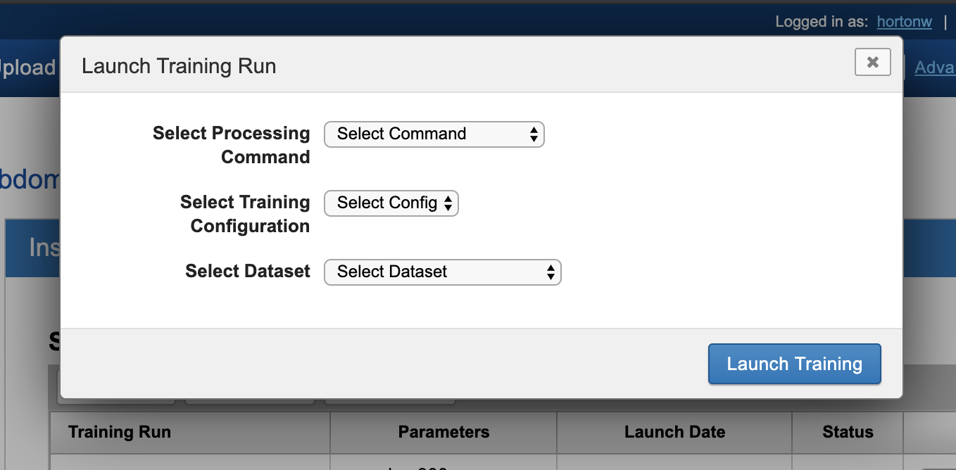 Once you have all your data in order and your model configured and ready, you can launch a training run using XNAT and your connected processing resources. Follow the following steps: