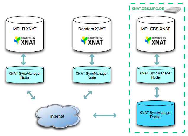 Due to these benefits, the decision was made to roll out an XNAT installation at each centre, and implement a tool to sync XNAT data between the separate servers in the background, through web services that access the REST API through PyXNAT. The result is effectively a small-scale content distribution system for multiple XNAT sites. The sync system, referred to as the Maxnet Cognition XNAT Sync Manager, consists of two components—the Node component that runs on each XNAT Server, and the Tracker component that is currently hosted at the MPI CBS.