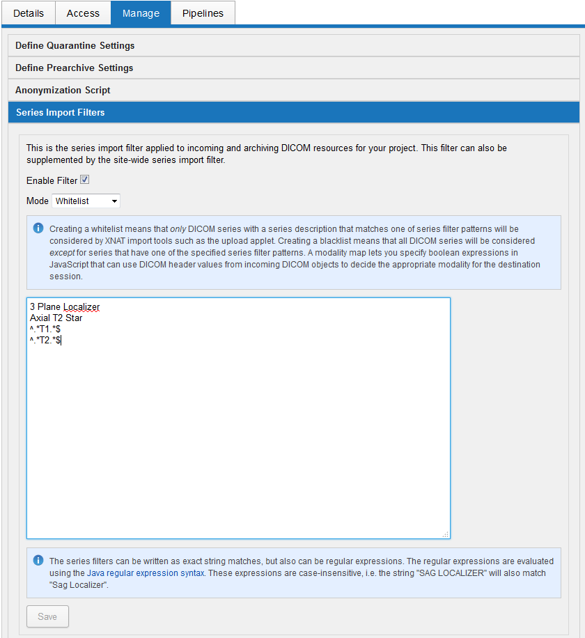 Maybe the safest route, whitelists allow the administrator to enter the names or patterns identifying the names of scans that are deemed safe to archive. To get to the project series import filter, go to your project page, click the "Manage" tab, then "Series Import Filters".