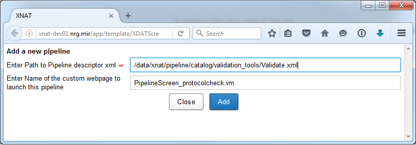 - You will see the message "Pipeline /data/xnat/pipeline/catalog/validation_tools/Validate.xml has been successfully added to the repository”