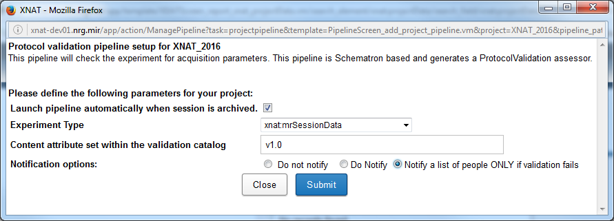 Add the Protocol Validation pipeline to project XNAT_2016