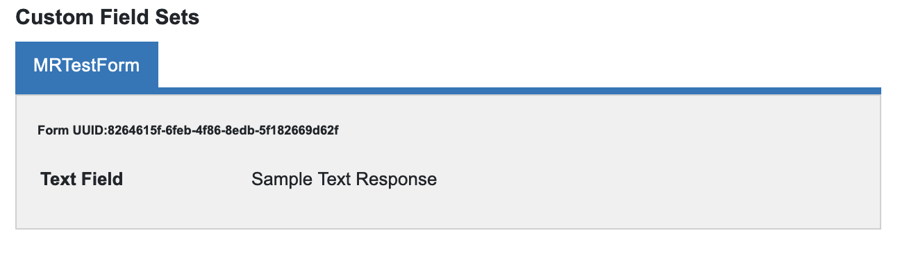 Each custom form has a unique identifier, also known as its UUID. Within the report and edit pages, the UUID will be found within 'Custom Field Sets' subheader and will look something like this: