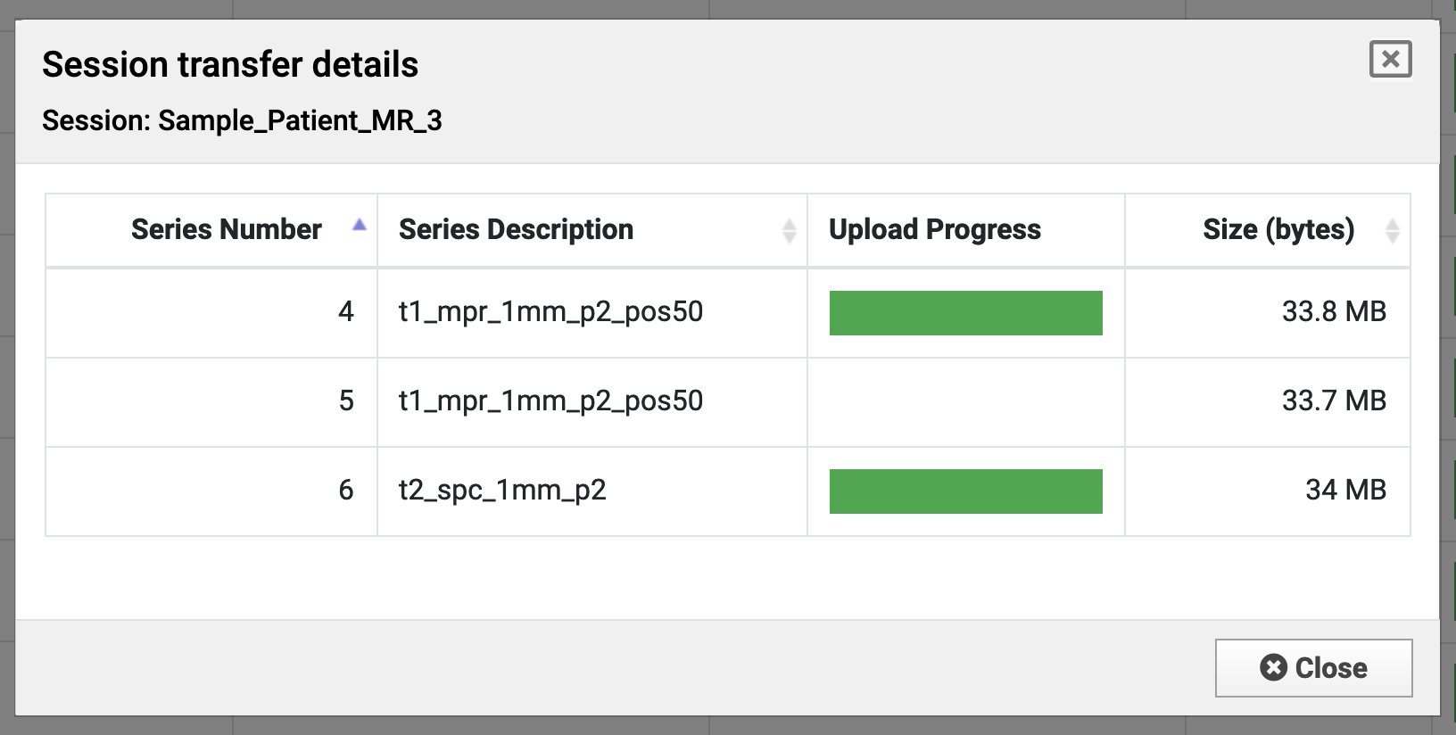 DicomEdit 6.6 adds support for instance file rejection, which means that an anonymization script defined at the site or the project level that rejects incoming scans will be applied within the Desktop Client before they are sent. For instance, if Scan 5 was rejected by the anon script, a successful upload in the Desktop Client may look like this: