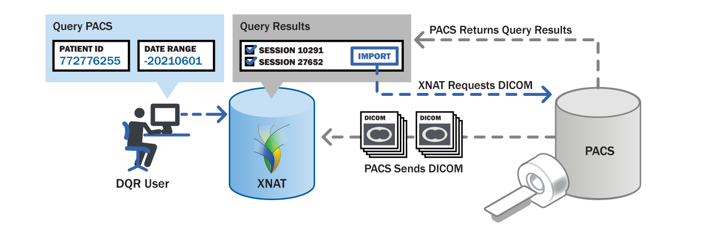 The Dicom Query-Retrieve (DQR) plugin allows XNAT users to connect directly to a PACS or other DICOM Application Entity, send queries to find studies, and import them to their XNAT with custom relabeling applied en route. Users can also send image data from XNAT to the PACS.