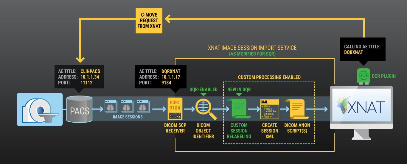 There is a default DICOM Object Identifier in XNAT, named "dicomObjectIdentifier", which makes multiple passes through the DICOM data to map its parameters to XNAT objects as described here: How XNAT Scans DICOM to Map to Project/Subject/Session. The DQR plugin adds a new DICOM Object Identifier, named "dqrObjectIdentifier". This is set up to coordinate with the DQR workflow, which involves a user in XNAT making a C-MOVE request for DICOM session files, and pre-assigning a project and new labels for the subject and session.