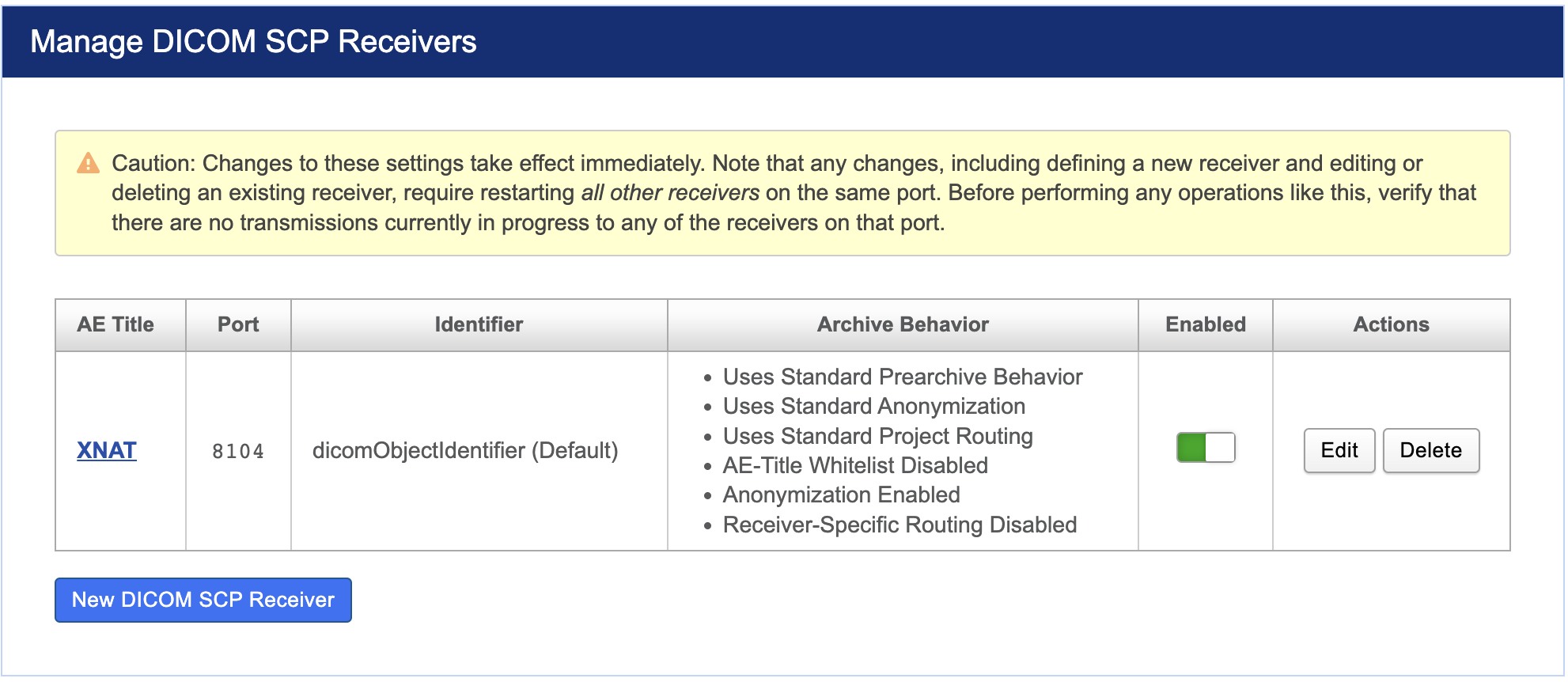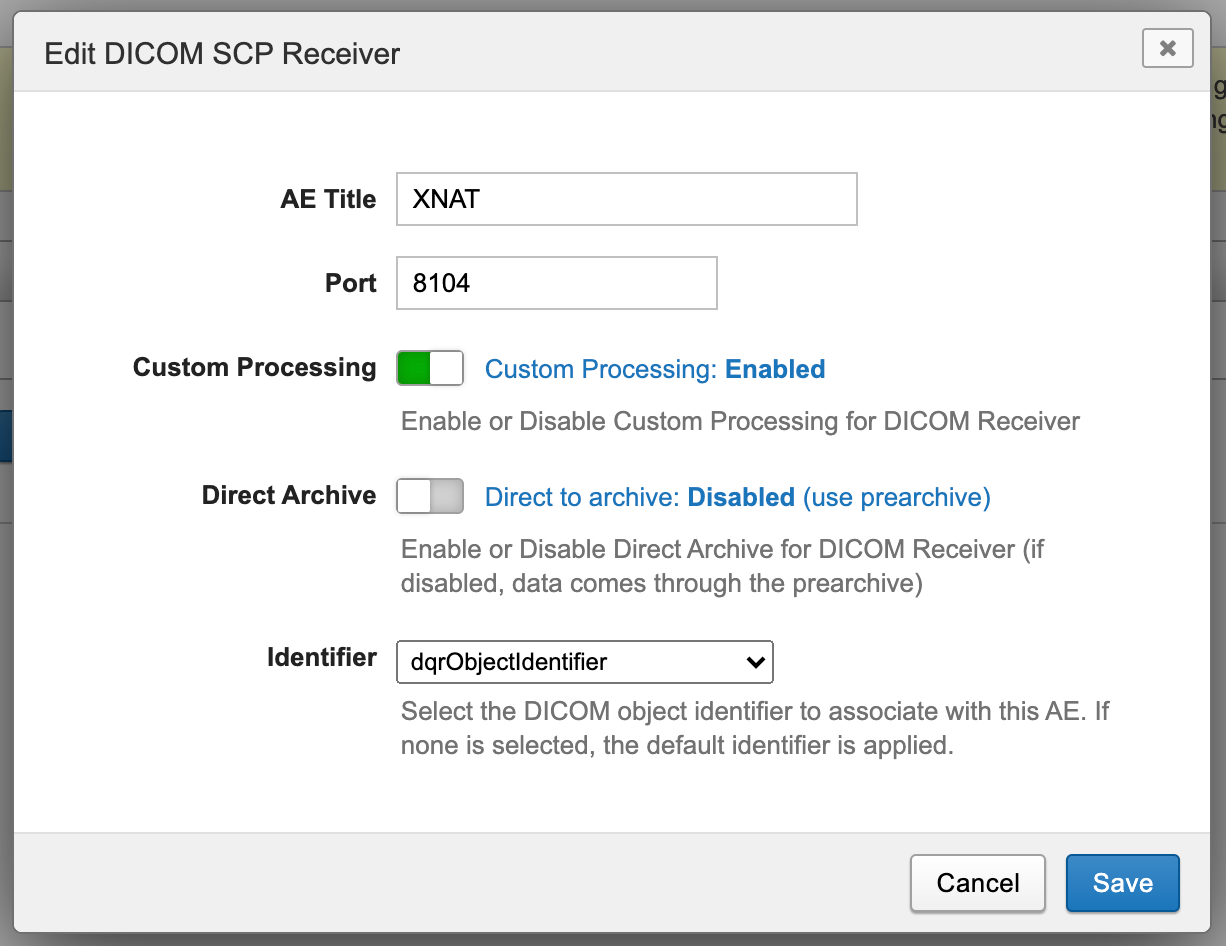 You can either edit the existing SCP Receiver to use the DQR-enabled Object Identifier, or create a new one. We recommend creating a new one, to avoid affecting any existing DICOM import behavior that uses the default receiver.