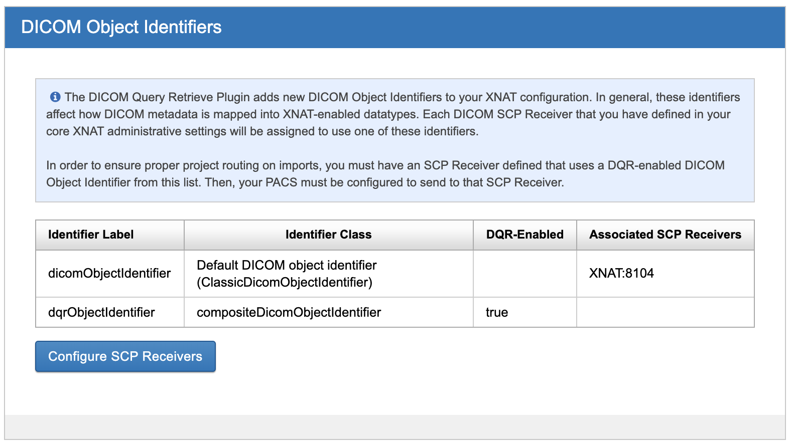 The DQR Plugin Settings Admin UI has a table listing all installed DICOM Object identifiers. This is for reference only. There is no configuration required here, but you will need to add or edit your XNAT's DICOM SCP Receivers to use one of the "DQR-enabled" DICOM Object Identifiers.