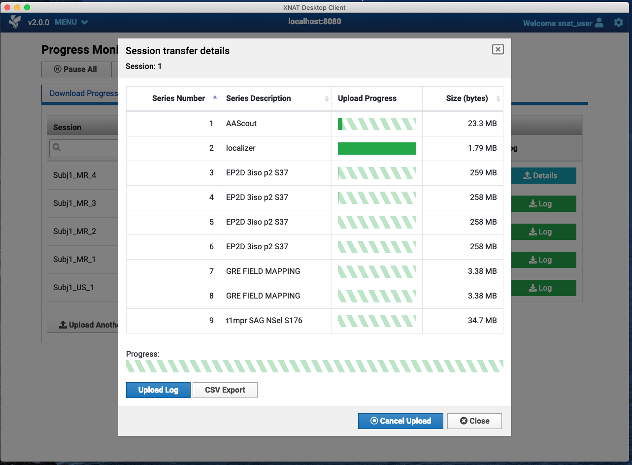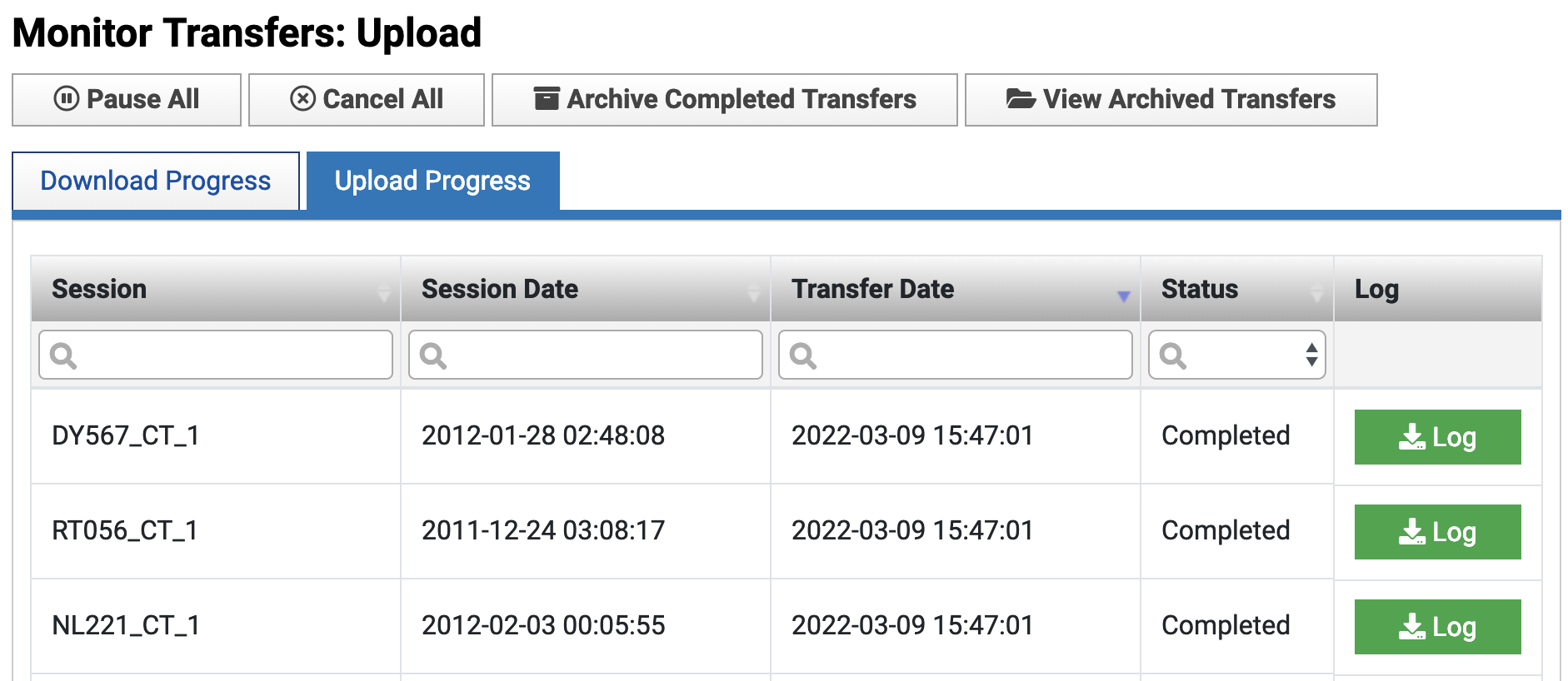 The XNAT Desktop Client has a data transfer management panel for both uploads and downloads, allowing you to see the progress of the actions that you initiated. You can also pause, resume, or cancel those actions.