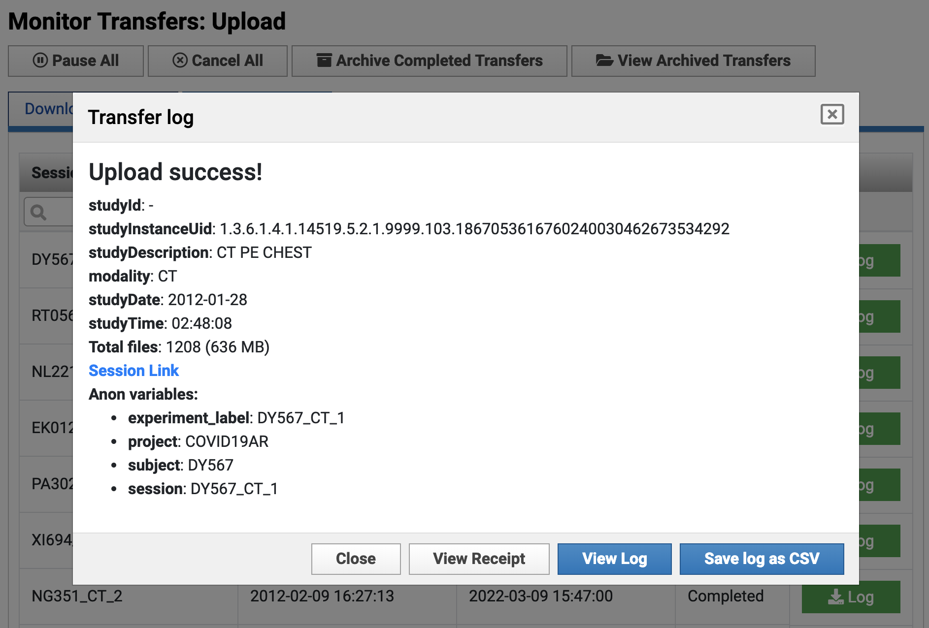 If you had clicked on the Details button to observe a transfer, the application displays a dialog box when the session upload is complete. If you did not click the Details button, the transfer completes and a Log button is available to you. Click on that button to see the same dialog box.