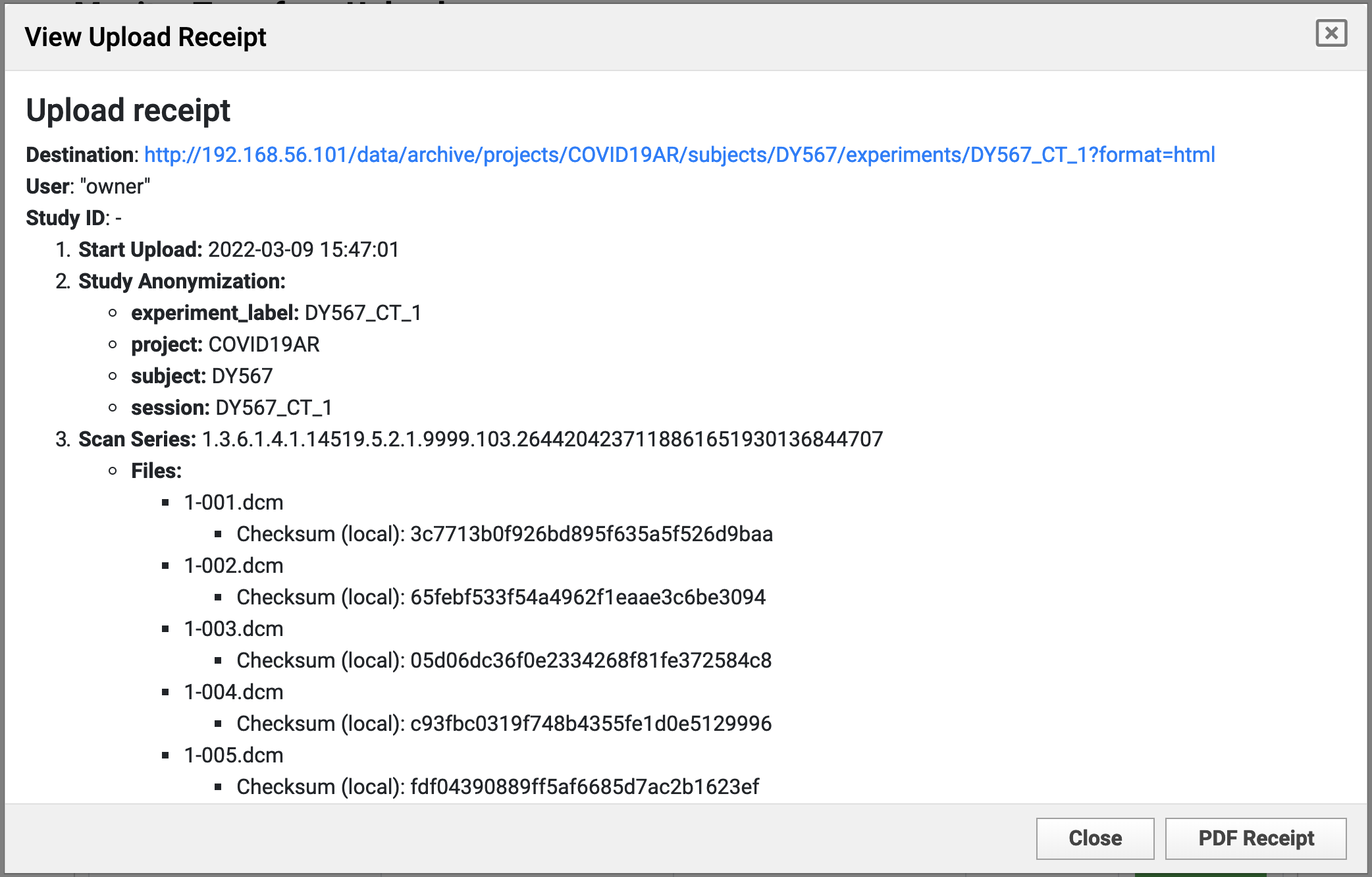 - View Receipt - displays a granular, file-by-file log of all upload activity, including checksums on local files to ensure that they match your uploaded files. You can also save this receipt in PDF format.