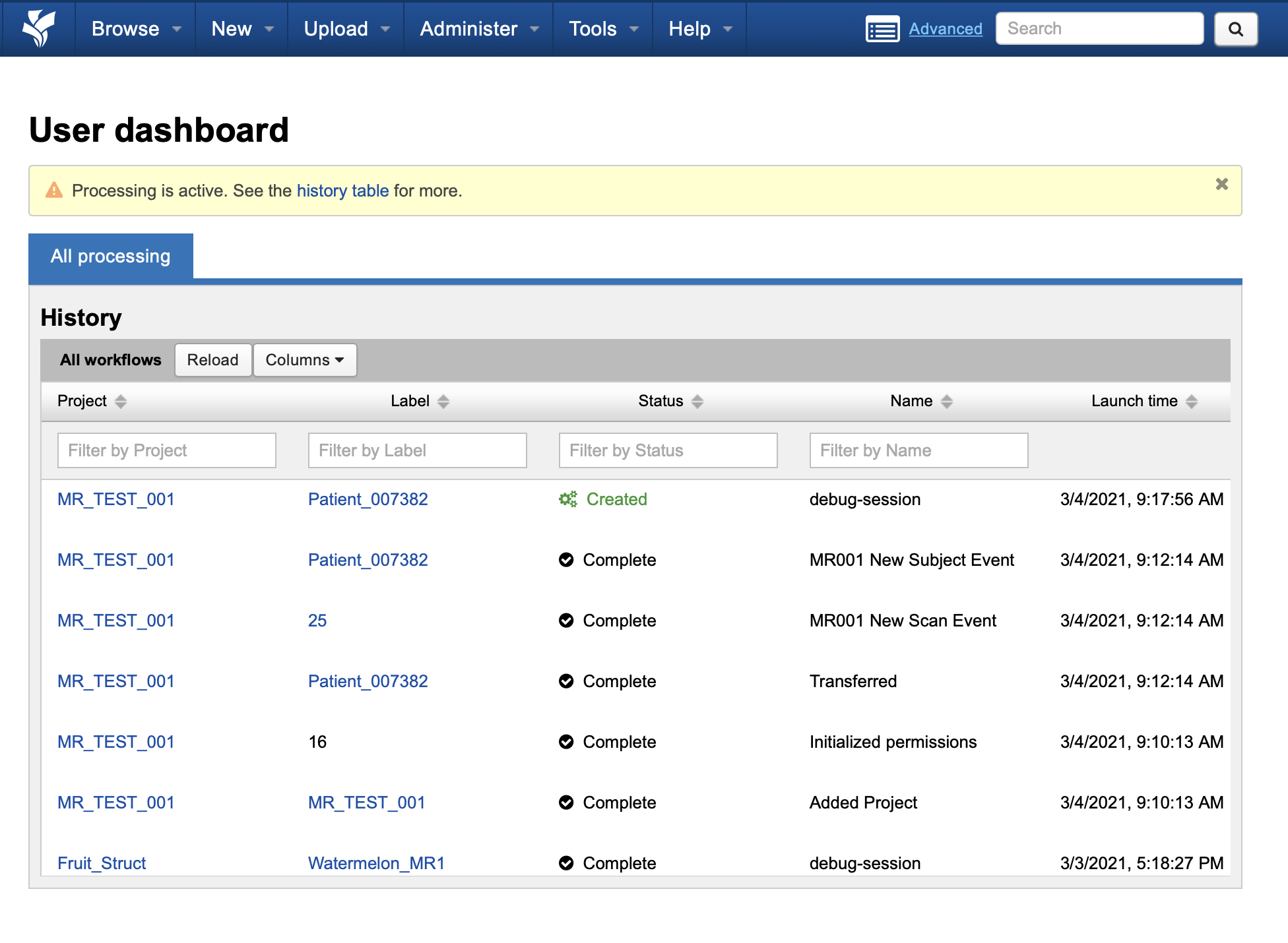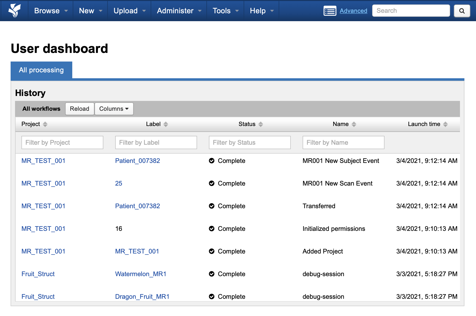 User Dashboard functionality included with the Batch Launch plugin provides users with the ability to monitor, inspect and terminate various workflow-associated processes in XNAT.