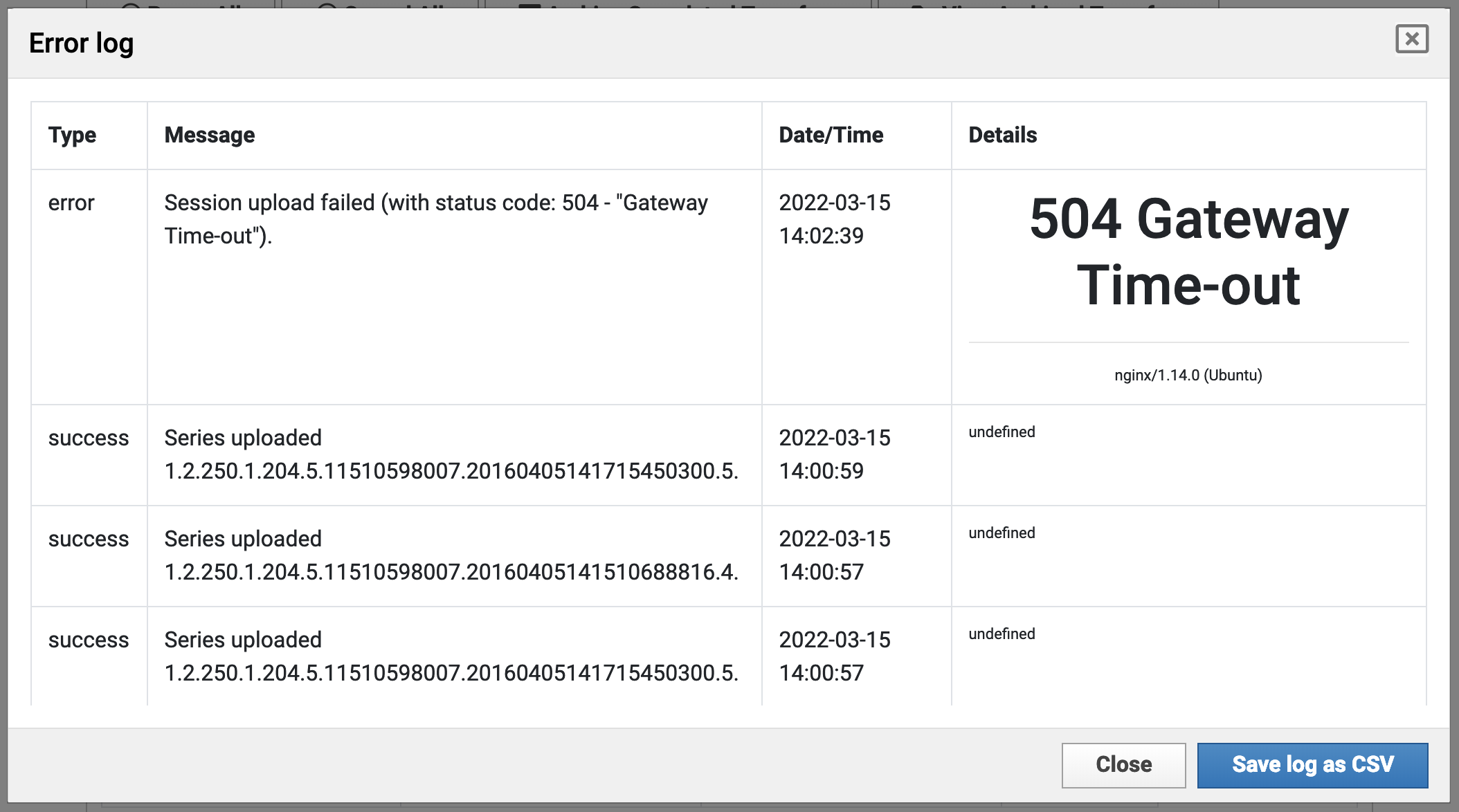 The XNAT Desktop Client waits until it has confirmation of image sessions being received and built before declaring success. If you see an error log like this, where individual files are successfully uploaded but then XNAT fails to report successful session building, this may be what happened.