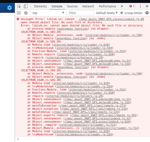 If your Linux installation appears to fail on startup, look for an error message like this in your DevTools console (viewable by clicking "Toggle DevTools" in the DevTools menu).