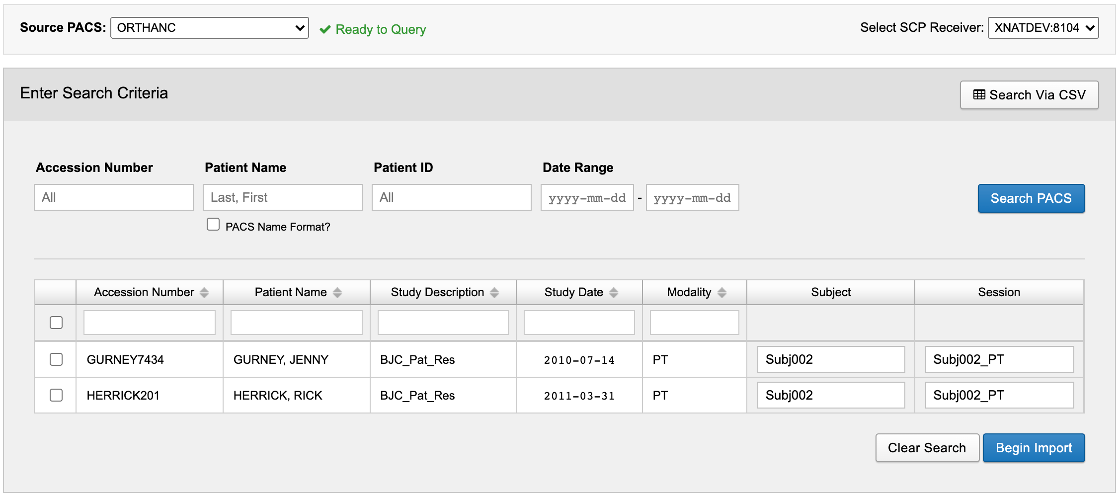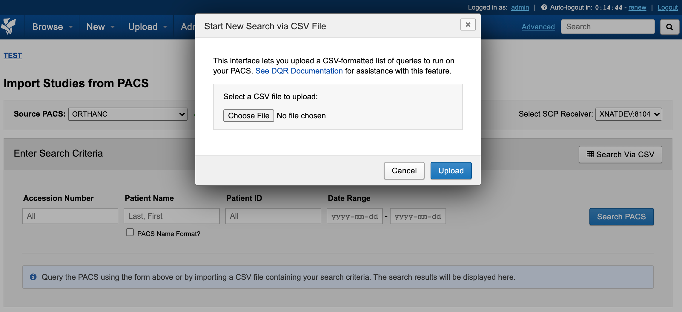 At this point, you can upload a CSV file that contains a list of queries for sessions on the remote PACS system. There are many ways you can structure these queries in the CSV file. Read below for instructions on writing and formatting these files.