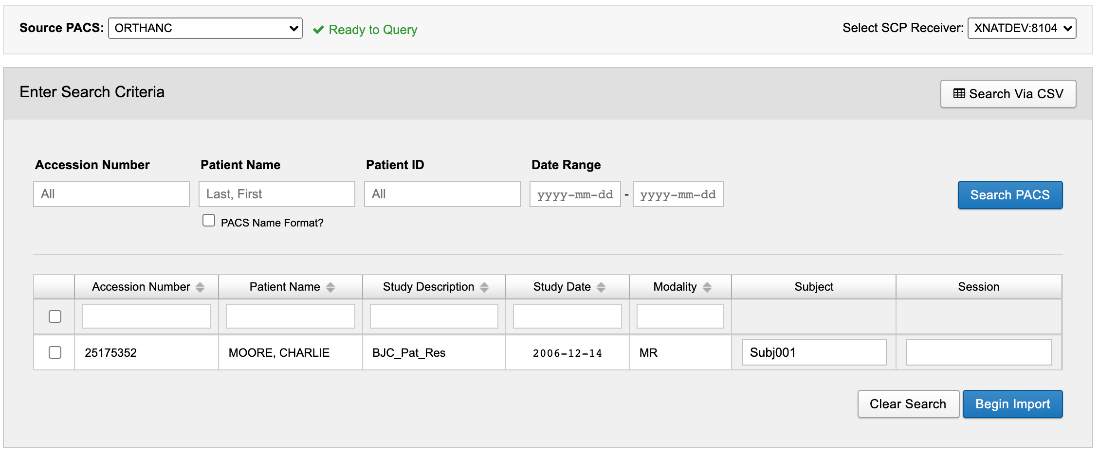 Let's say that I want to import a single study whose Accession Number I know, 25175352, and have that study appear in XNAT as a session under a subject named "Subj001". To do this, I could upload the following file: import-example1.csv