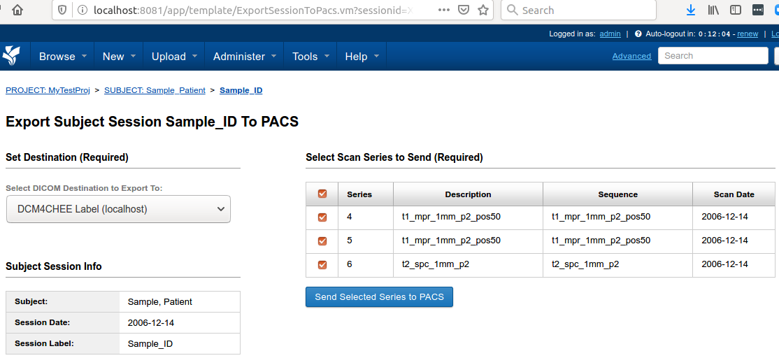 You will then see a view of the scans within that session, with a selector in the left sidebar to select a destination PACS. You can select any PACS system that has been designated as "Storable" in the DQR plugin settings. By default, no scans will be selected.
