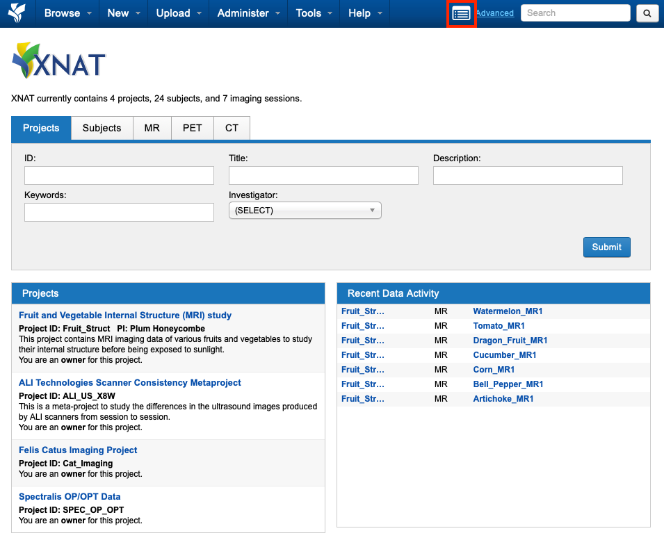 Access batch launch functionality under the Actions → Processing Dashboard menu on a project page. Select the parent XNAT datatype you wish to process. For example, select "MR Sessions".