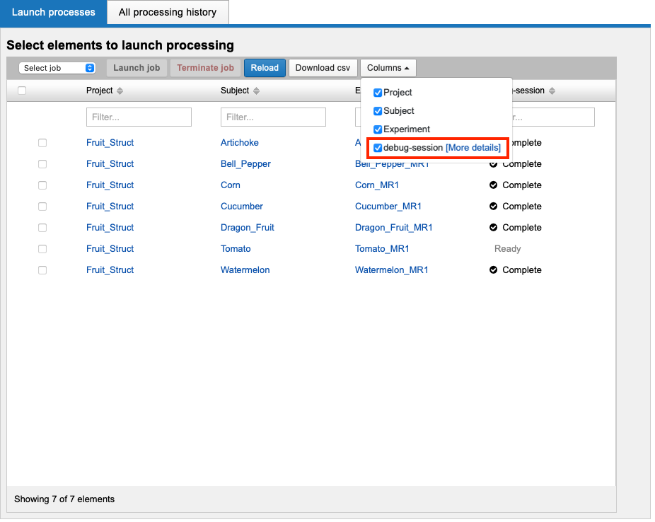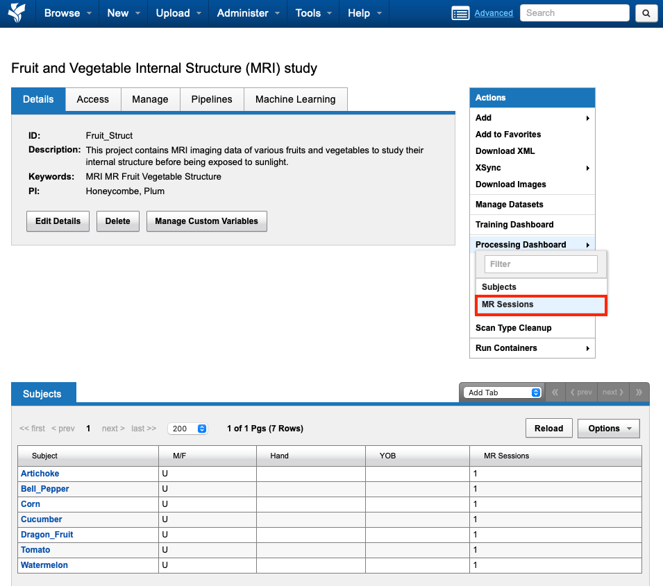On the Processing Dashboard page, MR Session data are listed along with enabled Container Service commands that can run on image sessions. Please note that only commands that are enabled in your project will be shown.
