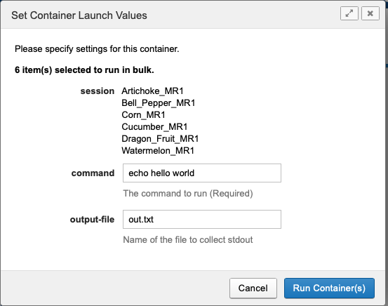 The container launch window shows resolved command parameters and user-settable inputs. User-settable inputs will be identical for all batch-launched containers. Select Run Container(s) to add containers to the queue and launch when resources are available.