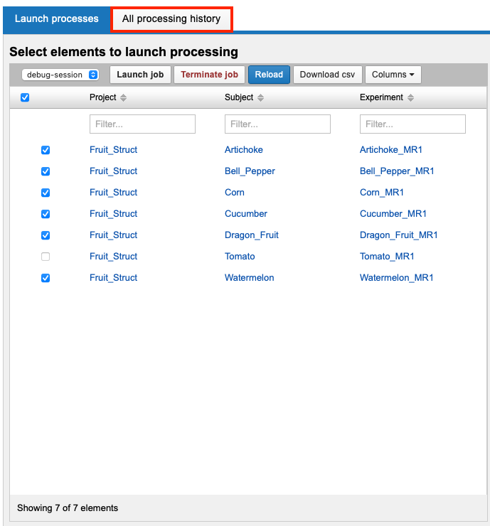 After container launch, processing history is available on the All processing history tab, as well as in the User Dashboard UI.