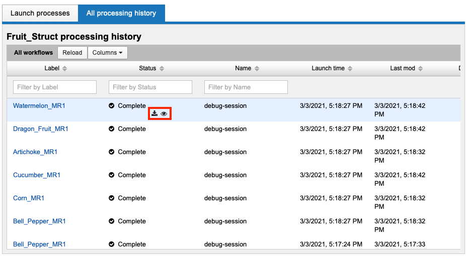 You can access processing history via the User Dashboard by clicking on this icon in the top menu bar.