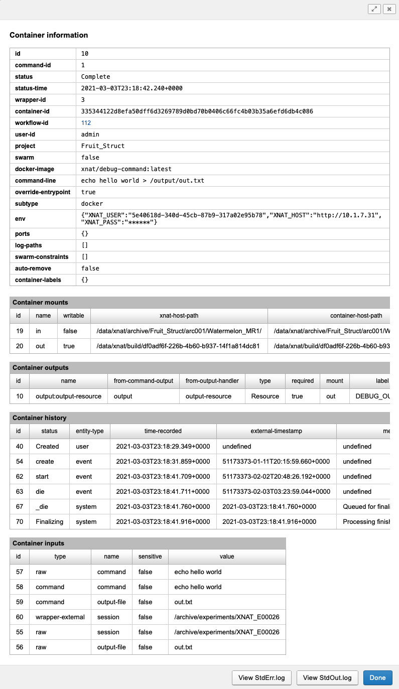 A container's history page shows resolved launch parameters as well as processing status and output logs.