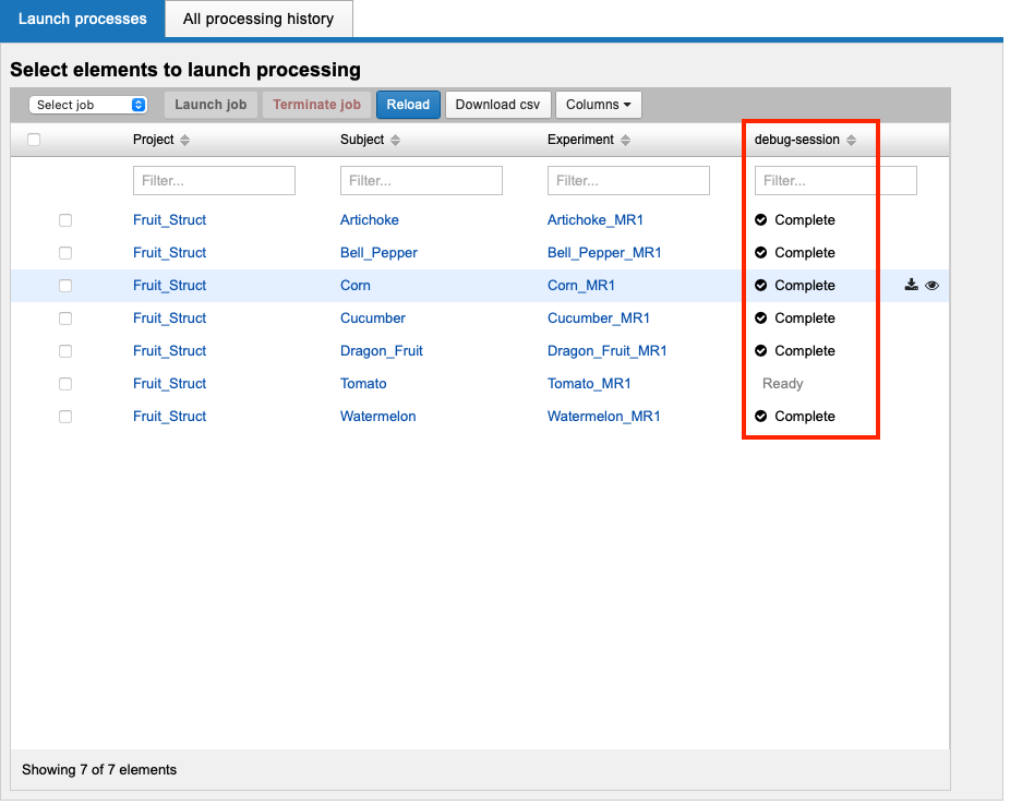Once container processing has finished on an XNAT object, the Processing Dashboard lists the outcome as a sortable column.