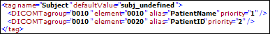 describes the creation of "Subject" tag from a DICOM file. First, the program will try to find value of DICOM tag (0x0010,0x0010) in the file, and if empty, try the (0x0010,0x0020) tag, and finally, if both patient name and patient ID tags are undefined (which should never happen as it constitutes severe DICOM violation), will use a "subj_undefined" value for the "Subject" tag.