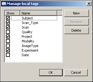 Define tags. Open tag management dialog by "Manage tags"toolbar command, or Repository->Manage tags menu command. (You'll see some tags already defined by default. These are XNAT ontology tags used by XND in communication with XNAT Enterprise installations. If you wish to re-distribute XND with your own set of tags, refer to Defining Custom Ontology). You can define any additional arbitrary tag names. Enable "show" checkbox to display column with values of this tag in the file view table.
