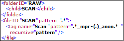 This inset will result in looking at all files in folder ‘RAW’ and assign tag named “Scan” to all files with name matching regular expression “._mpr-._anon.”, with tag value equal to a literal between ‘._mpr-’ and ‘_anon.’, e.g. file ‘OAS1_0061_MR1_mpr-1_anon.img’ will be assigned tag ‘Scan’ with value ‘1’.