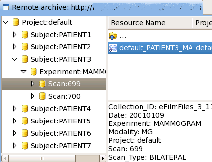 Remote repository view. XND supports single remote view of another XND repository instance, using XNAT File Repository web services API. Current version does not support user authentication, so use caution. To make your repository visible to another instance of the XND application, setup server connection in "View>Preferences" dialog. To view this repository from another computer, configure network address and port of the remote machine hosting XND in the View->Preferences->Client connection section, and use "Open remote view" toolbar or "View->Remote view" menu command. In case you need to reconnect, use "Connect to remote repository"command. An example of remote repository browsing is shown on Figure 4.