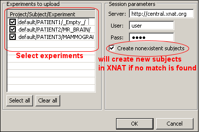 5. Select MR sessions for upload (modalities other than MR will be ignored), enter username and password and click OK.