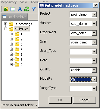 Attach tag values to files. Use "Set tag" context command to specify tag value. Some tags (such as modality) can have pre-defined values that you can choose from the drop-down list. You can assign values for all or some pre-defined tags (those listed in the default ontology xml) in one step, using "Set default tags" command.