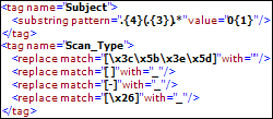 <substring> instructs the rule to use the first capturing group (i.e. elements caputred in () described in 'pattern' attribute, prefixed and/or postfixed with additional strings according to "value" attribute value. Thus, the rule based on the inset will replace value of tag 'Subject' of type 'nnnnabcd' with strings '0abc'. There can be no more than one <substring> element for each <tag> block.