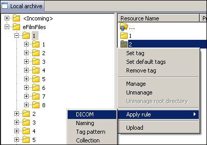 In many cases, underlying data files already contain meta fields that can be automatically translated to the useful "tag-value" pairs in XND. This is done through mechanism of tag generation rules. Each rule creates tag values for a given file based on contents (such as DICOM rule), previously existing tags (tag pattern rule), or context in directory structure (naming rule). To generate tags with specific rule, use corresponding rule command from "Apply rule" context submenu. As an example, DICOM rule will parse all valid DICOM files in selection, and generate XNAT-specific tags based on DICOM tags. You can see which DICOM tags are used, and also define your own DICOM rule by modifying rule definition XML file (see Defining custom DICOM rule).