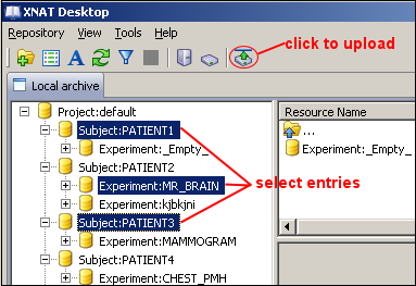 XND supports upload of XNAT MR sessions (roughly corresponding to Study level in DICOM terminology) on per-session basis. In XNAT ontology, MR session is an example of experiment (hence the 'Experiment' tag). To upload an experiment (including non-DICOM images and arbitrary resource files) to XNAT server: