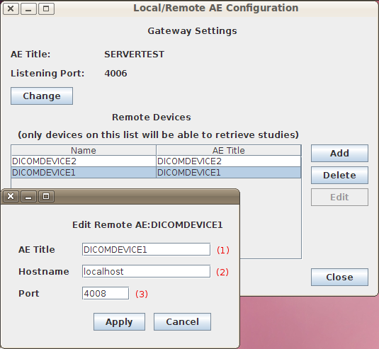 - Add this device's listening port to Dicom.RemoteAEs.<NAME>.Port. For the OSIRIX example, add "Dicom.RemoteAEs.OSIRIX.Port=listening_port".